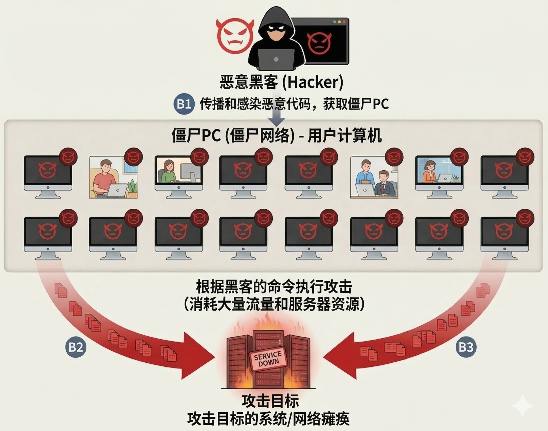 악의를 가진 해커가 좀비PC(사용자 컴퓨터)에 악성코드를 통해 감염시킨 후 좀비PC를 이용하여 특정 사이트(또는 IP)에 대량의 트래픽 및 서버 자원고갈을 발생시켜 공격 대상의 시스템/네트워크를 마비시키는 공격을 말합니다.