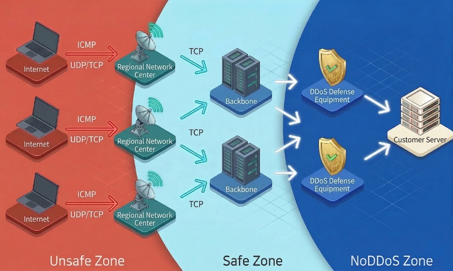 3중 DDoS 보안존을 구성하여 DDoS 공격 발생 시 1차로 지역별망센터에서 UDP, ICMP 등 네트워크 공격 유해 트래픽을 차단하고 2차로 백본(Backbone)에서 TCP 방어를 진행, 3차로 10G급 DDoS 전용장비 8대로 Get Flood, CC Attack 등의 웹부하공격을 차단하는, 다중 방어 시스템으로 구성되어 있습니다.