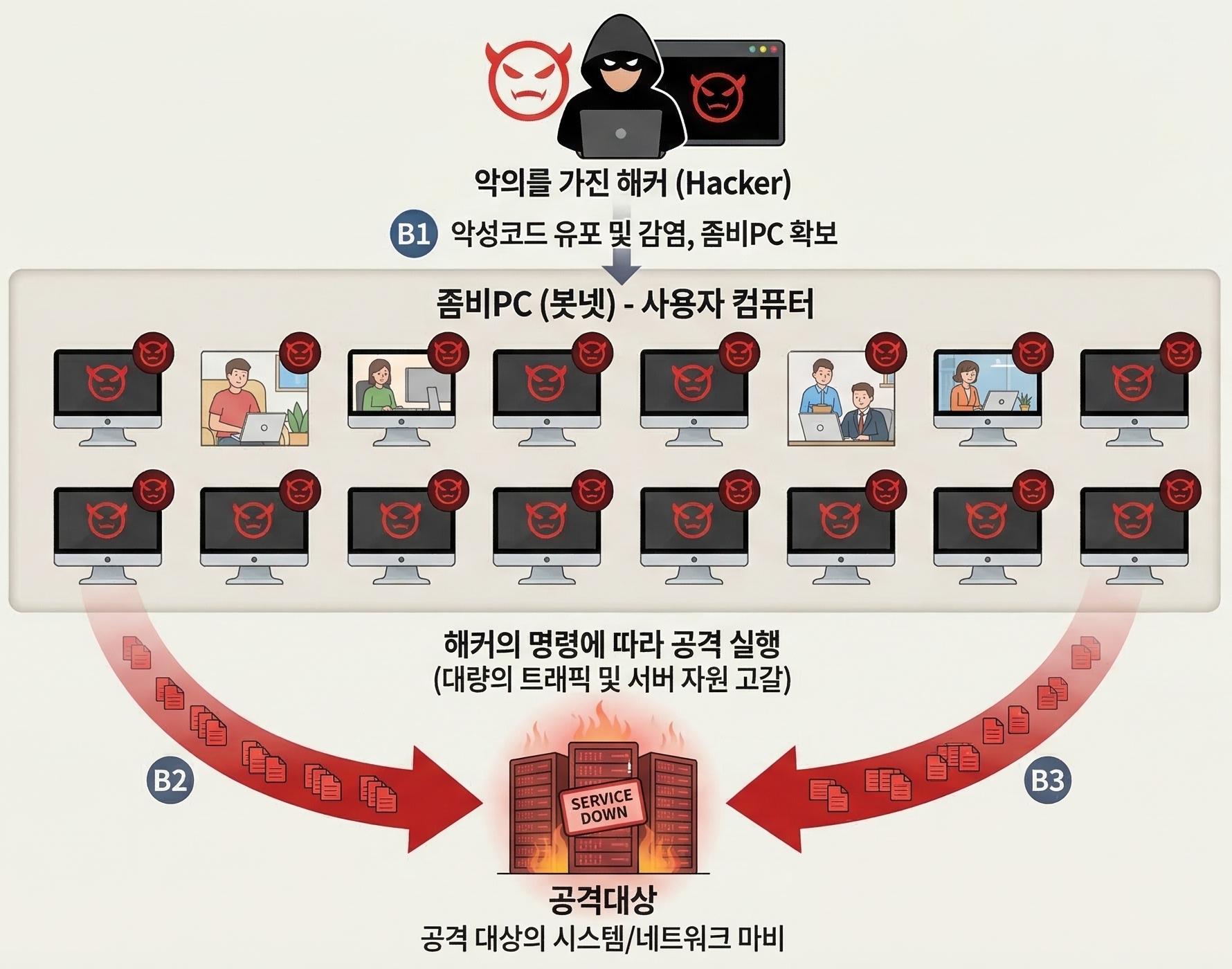 악의를 가진 해커가 좀비PC(사용자 컴퓨터)에 악성코드를 통해 감염시킨 후 좀비PC를 이용하여 특정 사이트(또는 IP)에 대량의 트래픽 및 서버 자원고갈을 발생시켜 공격 대상의 시스템/네트워크를 마비시키는 공격을 말합니다.