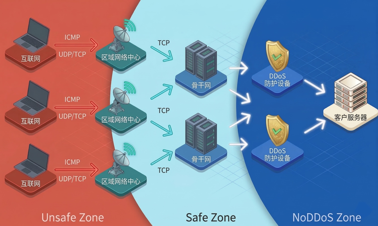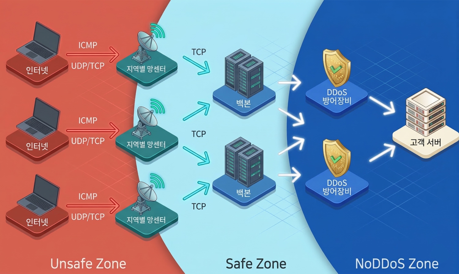 3중 DDoS 보안존을 구성하여 DDoS 공격 발생 시 1차로 지역별망센터에서 UDP, ICMP 등 네트워크 공격 유해 트래픽을 차단하고 2차로 백본(Backbone)에서 TCP 방어를 진행, 3차로 10G급 DDoS 전용장비 8대로 Get Flood, CC Attack 등의 웹부하공격을 차단하는, 다중 방어 시스템으로 구성되어 있습니다.