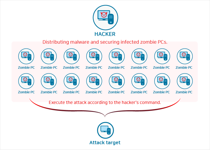 Malicious hackers infer the zombie PC (user computer) with malicious code and then use the zombie PC to create a large drain in traffic and server resources, resulting in an attack on the specific site (or IP).